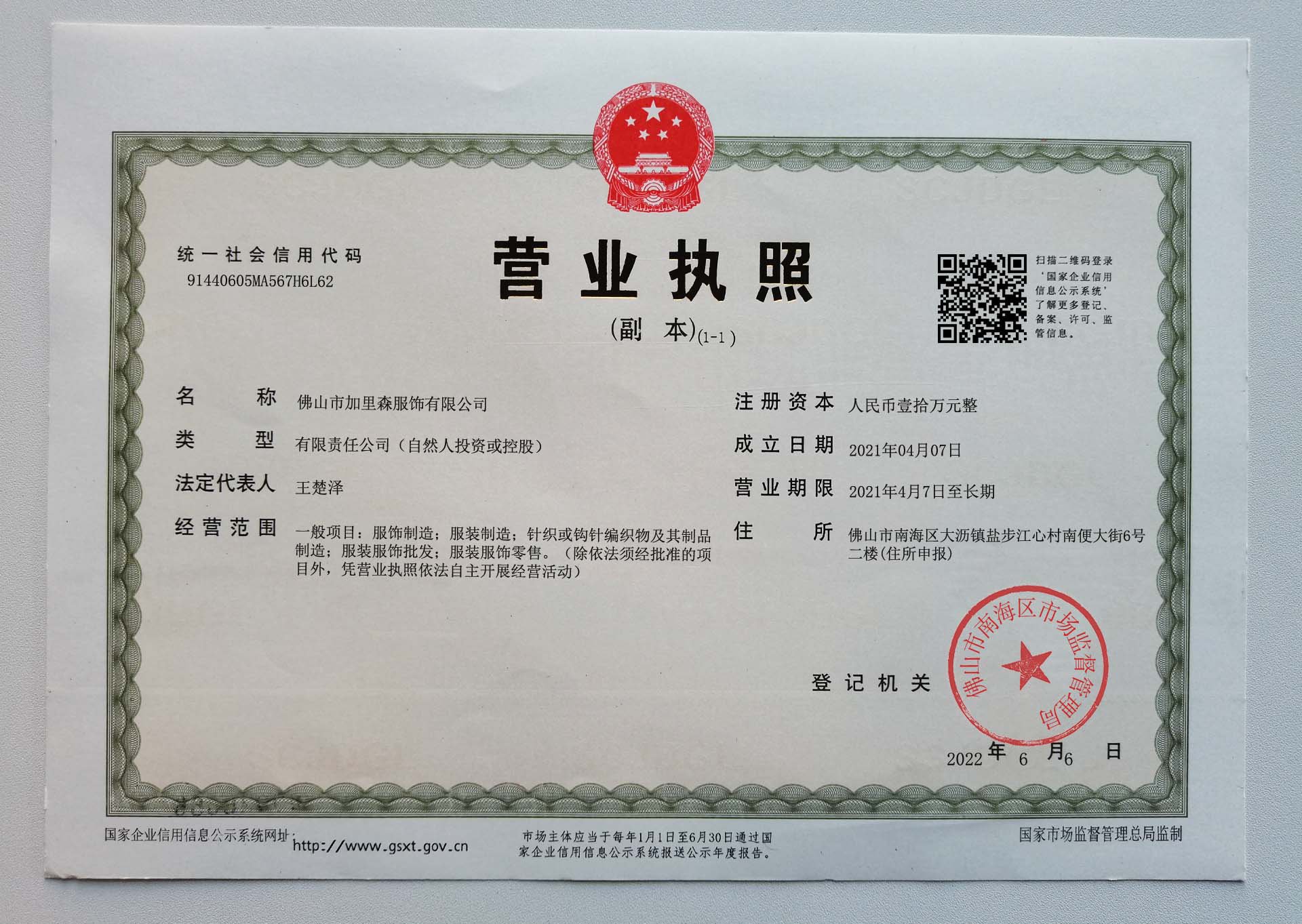 Corporate name:Foshan Garrison Garment Co., Ltd.